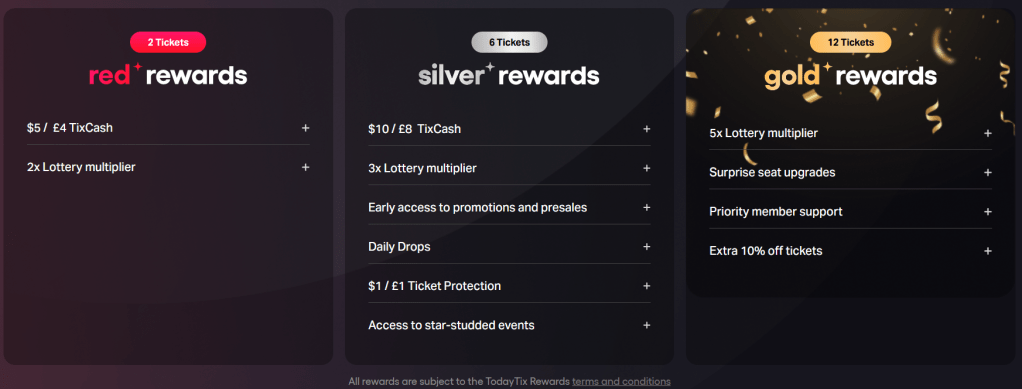 Today Tix’s new Rewards system promises several perks for repeat buyers, including up to 5x Lottery multipliers. Source: TodayTix