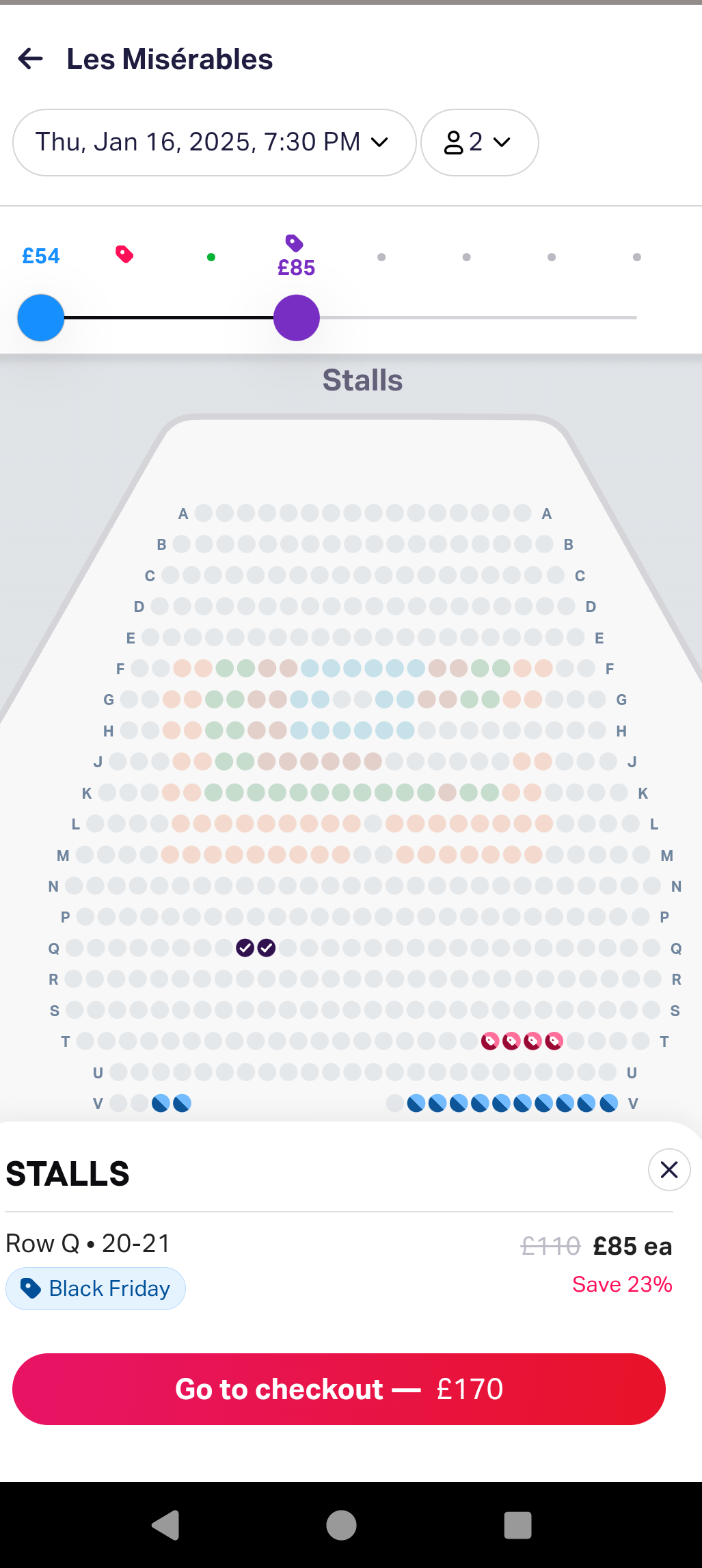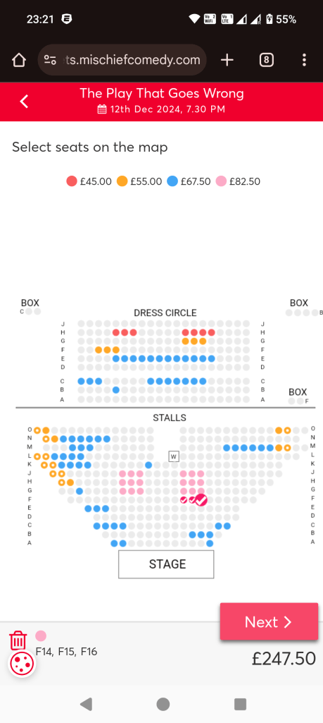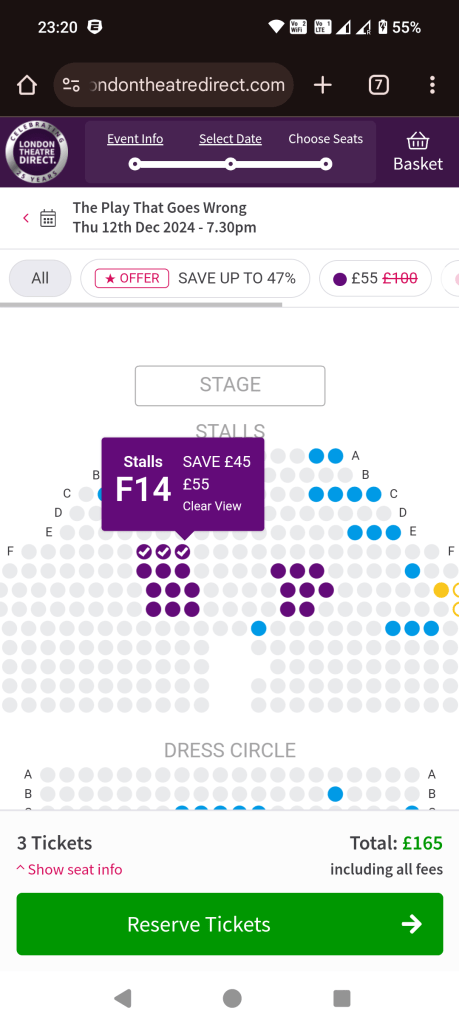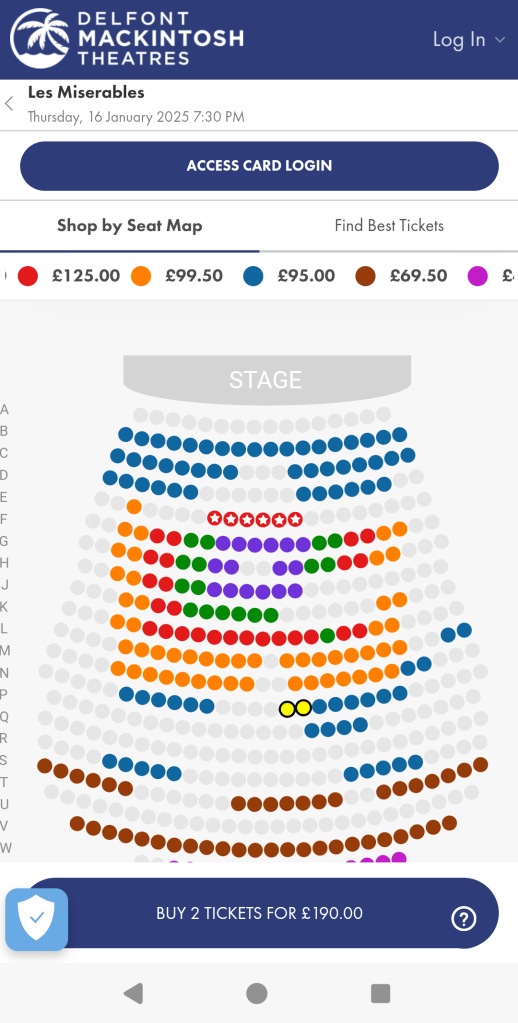 Notice anything? That’s right – the £25 discount on TodayTix is really only £10 off the price of buying it from the theatre, even without a sale. For £95 , the Sondheim theatre also offers seats much closer to the stage, including some pretty darn perfect seats in rows C and D. The moral of the story? Compare with buying direct before biting on a sale.